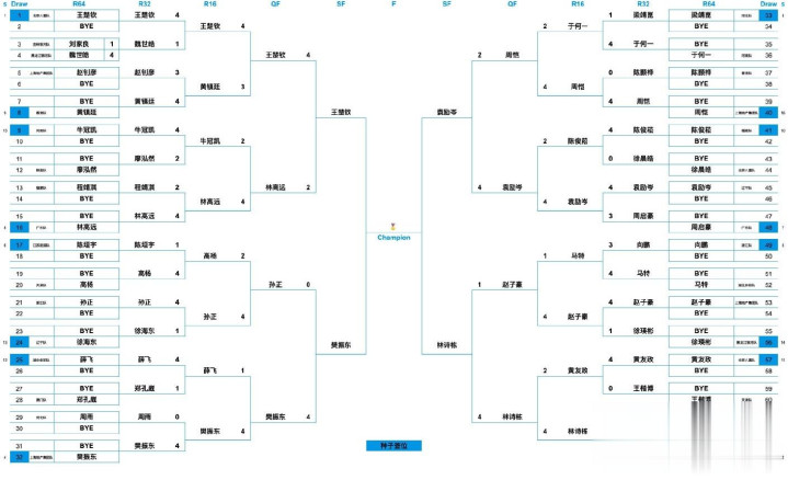 男单1号种子王楚钦(北京队)、男单2号种子林诗栋(海南队)、男单4号种子樊振东(上海队)、袁励岑(辽宁队)